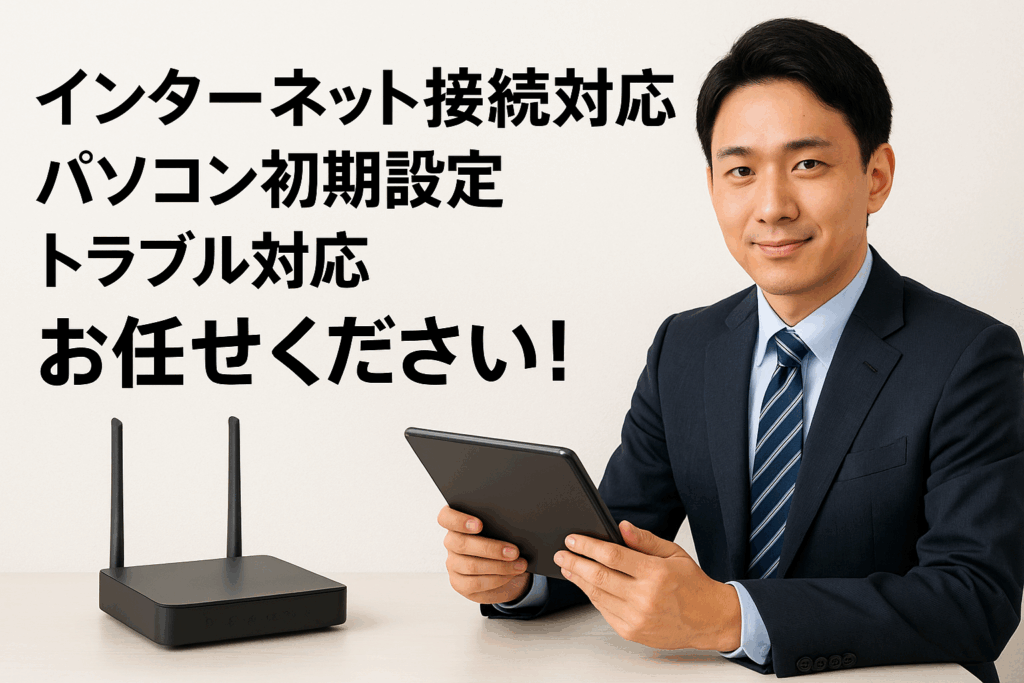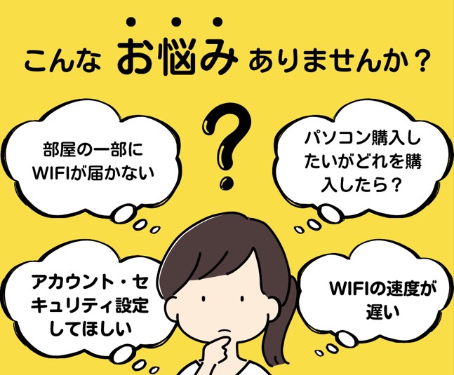 インターネット接続(Wifi、ルーター、モデム等)、初期設定、トラブルシューティング等、パソコン、スマホのことなら何でもご相談ください。